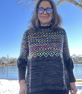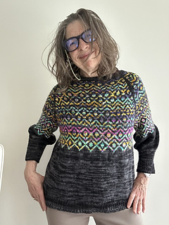 This top-down raglan-style sweater pattern uses Merino Cloud in Joshua Palm color way as the contrast color against the tonal black 2246 also in Merino Cloud. The repetitive easy 10-stitch pattern is worked by holding the two strands and knitting with the specified color while carrying the unused color in back of the knitting.