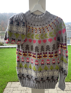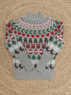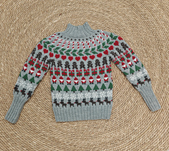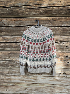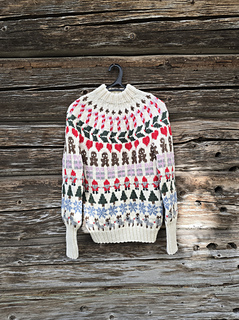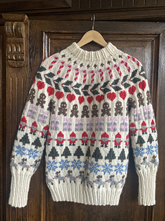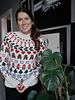 The sweater has all-over colorwork, so it doesn’t stretch like a single-colour sweater. Please take this into account when choosing size.