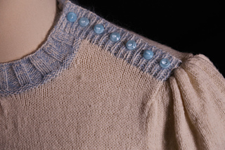My Helen cardigan is one of my most worn garments; I just love how the fit turned out. So for this pattern to accompany the article on puffed sleeves for the Fashion Framework series, I knew I wanted to take that silhouette and make it into a pullover. I envisioned a high neck, which would require a button placket at one shoulder in order to get the sweater over the head. I also envisioned a fuzzy “sweater girl” vibe for this design. In came Kidsilk Haze, held together with the wool yarn in just the ribbing sections. In addition to adding that wonderful halo, using a different color allowed me to add a pop of color in those ribbing sections as well, without changing the main yarn. I ramped up the puffed sleeves here by adding in short rows, which allows the puffs to rise up a bit. Optional sleeve supports worked on the wrong side help those puffs stay upright as well.