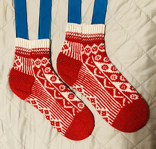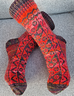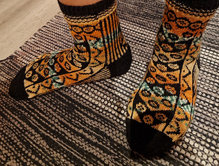 Teststrikket i Online 4-tråders sokkegarn og Opal 4-tråders sokkegarn på pinner 2,5. Lengde legg: 20 cm. Lengde fot: 25 cm. Totalt garnforbruk: 84 gram, hvorav 40 gram er bunnfargen.