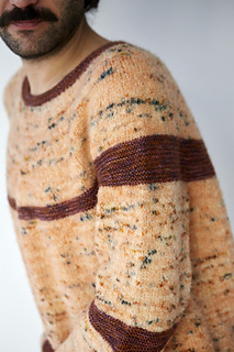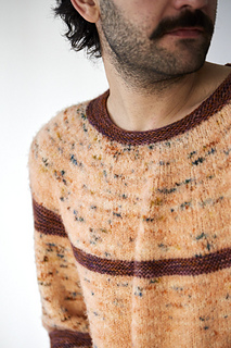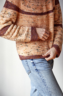 Jupiter is a dynamic, stripe-driven sweater featuring short row stripes placed around the neck, body, and edges, echoing the flowing bands of the planet it’s named after.