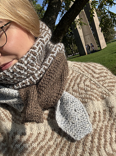Just a Dreamer is a two-colour scarf combining mosaic knitting with garter and broken rib. It starts with a narrow end worked in one colour, is increased to its full width, a longer mosaic section transitions the colour for the second end that is again decreased to a narrow point. If you use a precision scale, you can maximise the use of your yarn with the tips in the pattern. The English pattern contains both charted and written instructions for the mosaic pattern, Finnish is only charted.