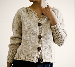 This cardigan is worked seamlessly from the top down. The neckline is shaped with short rows.