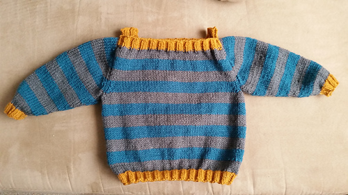 This beautiful knitted striped sweater with contrasting colour ribs and cuffs and a cute shoulder button fastening is a simple knit for your little one.