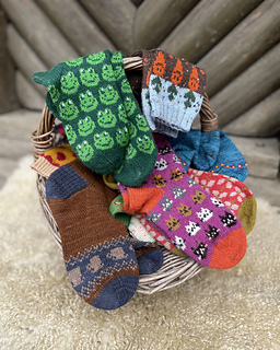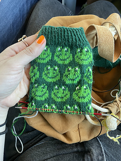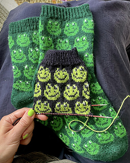 These socks are knit from the top down. They have a simple-to-knit frog face motif that starts from the top of the leg and repeats throughout the foot. The socks start with a ribbed cuff and feature a short row heel. Stitches are decreased for the toe and then grafted together.