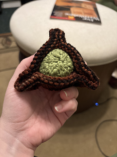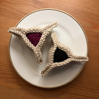 Purim is a holiday of celebration. Esther, the heroine of the Purim story, saved the Jews from Haman, the villain, who wanted to kill all of the Jews in the Persian Empire. There are many ways to celebrate Purim, including retelling the holiday story by reading from the Book of Esther, giving food gifts (mishloach manot) to friends, giving gifts to the poor, and sharing a festive meal. As with many holidays, there are traditional foods to make and enjoy. We turn the painful memory into sweetness by making and sharing hamantaschen, a filled cookie. I love trying different savory and sweet flavors when I make these cookies each year, and I enjoy sharing flavor ideas with family and friends in my community. KNIT HAMANTASCHEN is a fun way to experiment with making a knit version of this cultural treat! Constructed just like the hamantaschen you make in your kitchen, you’ll enjoy experimenting with colorful filling and practicing your folding technique with these knit cuties. One skein of worsted weight yarn is enough to make about a dozen cookies, and filling can be made with scraps of leftover colors. Make bigger or smaller cookies by adjusting yarn weight and needle size. Let your imagination run wild! This is a written pattern that includes photo and video tutorials for assembly.