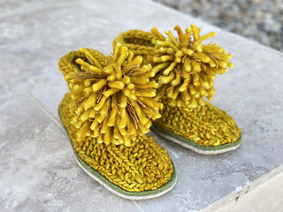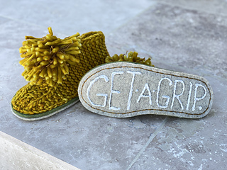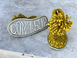 Taken from the Norwegian word “Koselig”, meaning ‘Cosy’. These slippers are everything they aim to be, with soft and thick woolly garter stitch textured uppers, sewn onto a pair of felted soles and topped off with large, shaggy pompoms. For added grip, liquid latex is painted onto the base of each sole (optional).