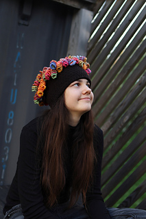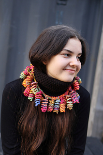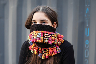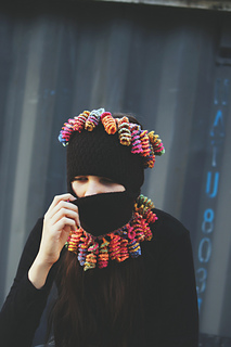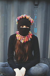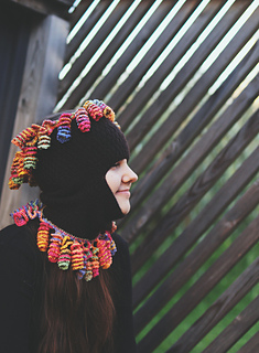 Seamless knitted tube with tentacle embellishments on both edges. Wears as a full balaclava, half face covering, cowl, headband, or open-top ponytail hat depending on configuration. Tentacles worked separately in any contrast yarn — stash friendly by design.