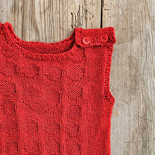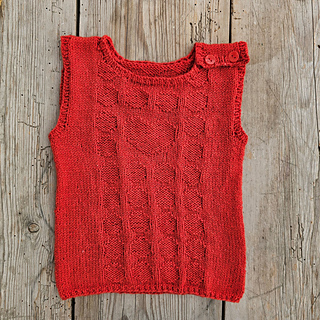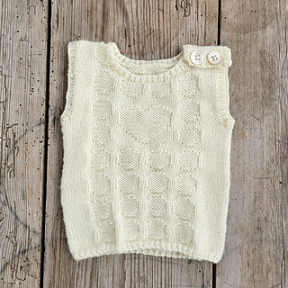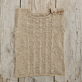 The vest is worked from the bottom up, starting with ribbing and a charted pattern. The work is then divided into front and back, which are finished separately. One shoulder is fastened with buttons for easy dressing and as a decorative detail.