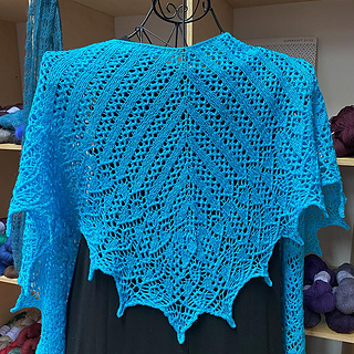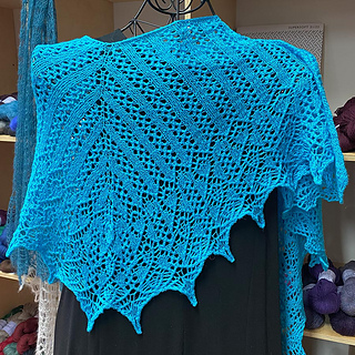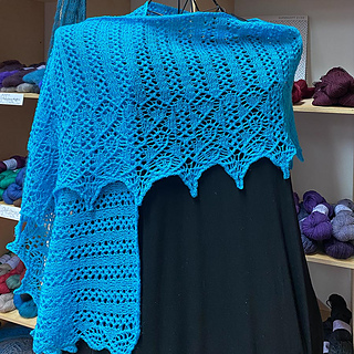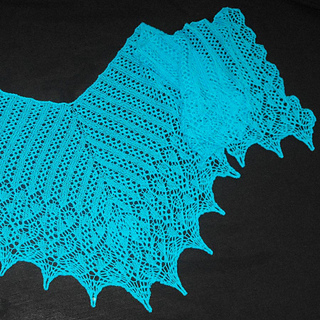 The angular shawl *Lady Moira* combines an intricate openwork with an elaborate lace edging.The chevron shape makes for a perfect shoulder fit. The shawl is worked from the neckline outward.