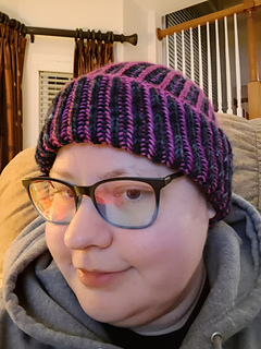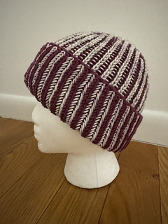 The Lallybroch Beanie is a classic folded brim beanie design knit in 2-colour brioche. It could be worn with or without a pom pom, and could be knit to a shorter length if you prefer no brim. It has crown shaping to curve around the top of the head, rather than the pointy/raised crown you see in some beanies. The hat is knit bottom up, in the round, and can be considered reversible (the crown shaping isn’t quite as clean on the wrong side, but still looks quite good if you wanted to wear it reversed). This beanie pattern is offered in 5 different size options (Baby up to Adult Large).
