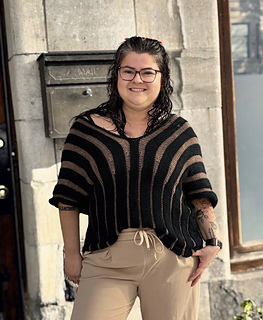 The Lana blouse is a side to side pattern worked all at once. Imagine you are working a long rectangle and the sides are sewn. The neckline is a bind-off/cast-on rows in the middle and it is tied on the back with I-cord or a bow. It is pretty much a rectangle with a hole in the middle. The textures formed by the Purl stripes on the Wrong Side make it a ver modern and contemporary fit.