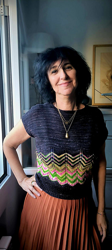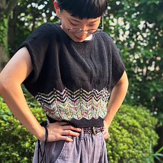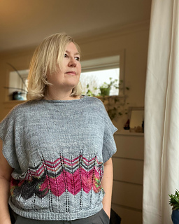 Knitted from the bottom with provisional cast-on, the chevron lace and Stockinette stitch patterns are worked in the round to the underarm. Front and back are worked flat separately before being joined at the shoulders with Russian grafting. Simple garter stitch edgings complete the armholes and neck opening. Stitches are picked up from the provisional cast-on to work the hem in short row shaping that accentuates the zig-zag shape of the chevron lace pattern.