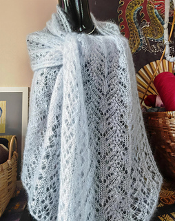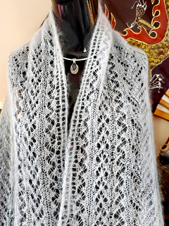 This full-sized wrap features a design that incorporates lace leaf and vine motifs. It is worked in Cascade Yarns Kid Seta – a luxurious silk and mohair lace weight yarn and weighs just 70g / 2.5oz. It is knit with larger needles to create an even loftier feel and to highlight the intricate lace patterns. The pattern is suitable for intermediate-level knitters.