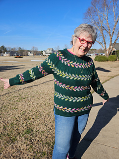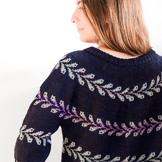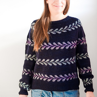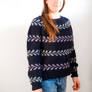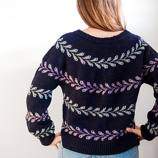 The Leafy Lane Sweater is a DK-weight, top-down pullover, worked seamlessly with bands of leafy stranded colorwork encircling the yoke, body, and sleeves. The leaves appear at regular intervals, separated by wide stretches of the main color, creating a chic sweater that is both fun and easy to knit, yet simple and comfortable to wear. A neat double collar and split hems add structure and comfort. Available in ten inclusive sizes from 37.75 to 68.25 inches at the bust, and designed to be worn with 3–8 inches of ease, the Leafy Lane Sweater is the perfect blend of relaxed coziness and pretty colorwork.
