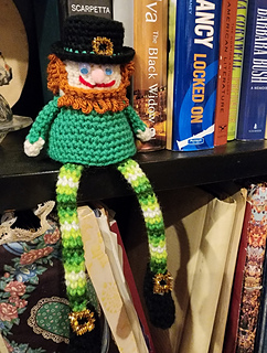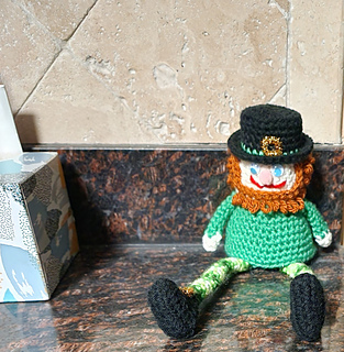 Crochet a cute little Leggy Leprechaun to sit on your bookshelf, mantle, or desk to bring the luck of the Irish into your life. He stands approximately 11” tall or 10” when sitting. Legs can be adjusted to be as long as you want.
