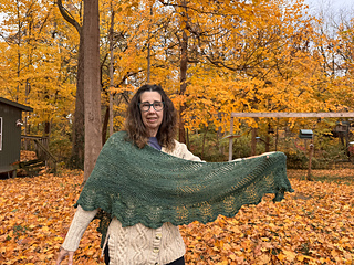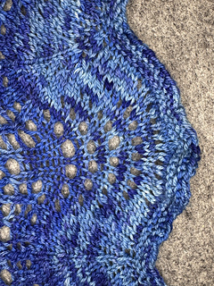 Double increases are worked adjacent to each border on every right side row and those increases creates the crescent shape. The body of the shawl has alternating sections of the textured stitch and an eyelet stitch. The alternating sections naturally swirl to the right because of the placement of each new section at the end of the right side rows. Once all 10 sections are complete, a wavy border is added to the shawl to create a very pretty finish.