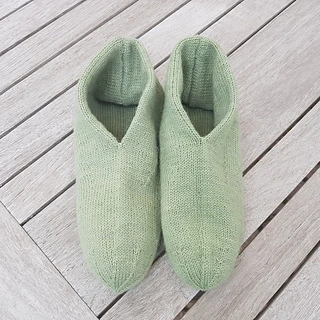 Die leichten Puschen sind für kühle Sommerabende gedacht und deshalb aus normalem Sockengarn, aber doppellagig gestrickt. Dabei werden Außen- und Innenschuh am Stück gleichzeitig gestrickt. Beide Teile werden nach Fertigstellung ineinander gestülpt. Auf den Fotos ist die Variante für kräftige Füße gezeigt, Angaben für schmale Füße sind ebenfalls gegeben. Beides Mal sind die Angaben für Größe 41 gemacht, aber für Größe 40 oder 39 kann man die Anleitung ganz leicht abwandeln, indem man die Fußlänge einfach entsprechend kürzt. Die Maschenprobe sollte unbedingt eingehalten werden, damit die Puschen fest am Fuß sitzen und weil die 100 g Sockenwolle nur ganz knapp für Größe 41 reicht.