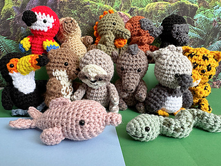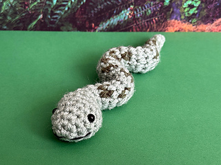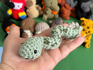 The Little Anaconda is the final animal of 12 animals in the Little Amazon Mini Amigurumi Crochet Along. It joins the Mini Macaw from Day 1, the Little Capybara from Day 2, the Itty Bitty Iguana from Day 3, the Mini Monkey from Day 4, the Tiny Toucan from Day 5, the (Not So) Giant River Otter from Day 6, the Small Sloth from Day 7, the Tiny Tapir from Day 8, the Little Harpy Eagle from Day 9, the Little Pink Dolphin from Day 10, and the Little Jaguar from Day 11. It is about 8” long and a chenille stem inside makes it bendable.