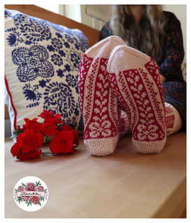 Pikku-Ellien 8-sivuinen PDF-ohjelehtinen sisältää hyvät kaaviokuvat ja sanalliset ohjeet söpöihin kirjoneulesukkiin:
