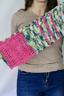The design begins at the center with a striking contrast-color lace panel — a quiet focal point that feels both graceful and modern. From there, stitches are picked up along each side to create two garter stitch wings that unfold outward like petals. Fine, descending stripes travel down each wing, adding subtle movement and a touch of playful charm.