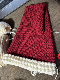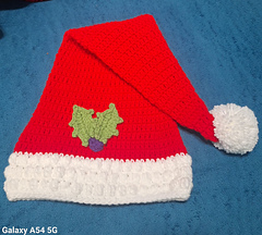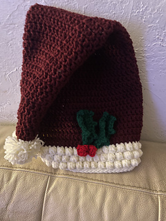 Hat is worked from the peak toward the brim in one piece. Pompom and holly leaf motif made separately.