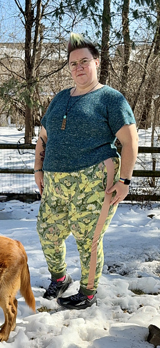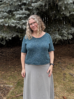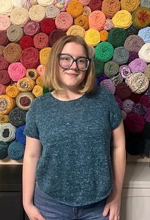 The designer is wearing Size B. Their measurements: 33” / 84 upper bust and 34” / 86.5 cm full bust, with 11” / 28 cm upper arm.