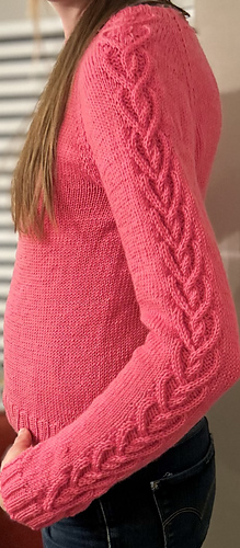 The Lovely Sweater is knit top-down in raglan style. The body is knit in stockinette with no shaping to create a gently fitted silhouette. The sleeves include an elegant and timeless celtic heart cable down the length.