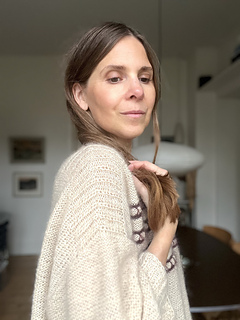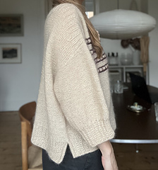 The blouse is intended to have a slightly cropped fit.The dress version is intended to cover the knee. Sleeves are designed for a ¾ length. The piece is knitted top-down, making it easy to adjust both body and sleeve length to your preference.