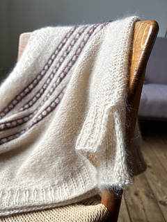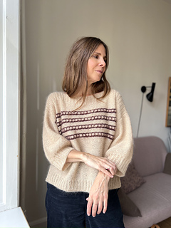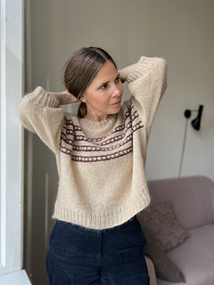 The blouse shown is knitted with one strand Spinni in color 58 held together with one strand Silk Mohair in color 6, and Silk Mohair in color 36 for the pattern section.