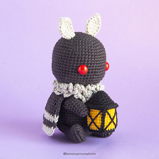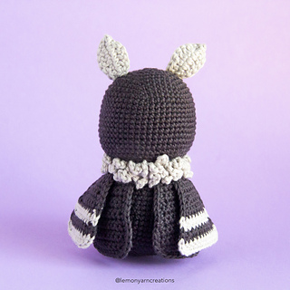 The pattern is written in U.S. terminology. The main part of this project is worked in rounds so you might want to use a stitch marker to mark the end of each round. There is no specific gauge for this project, just try to keep it tight and even throughout each piece. Lucius the Mothman measures approx. 13cm (5.1in), when using the same yarn/tools as indicated below and working with the “x” single crochet technique (yarn under, yarn over).