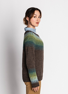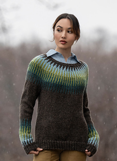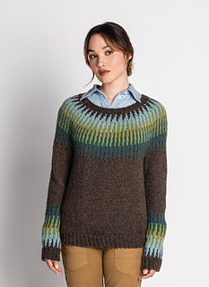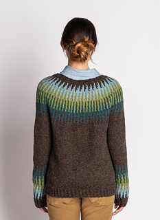 The yoke of this colorwork sweater was inspired by the horizon and landscape of mountain ranges, and the pattern is echoed in the sleeves.