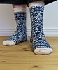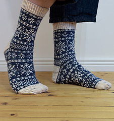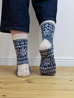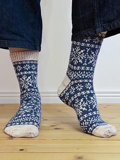 These cuffs down socks begin with a neat twisted ribbing. Stranded colorwork is worked on the leg and foot. They feature a French heel with gusset decreases placed at the bottom. They also feature anatomical toes.
