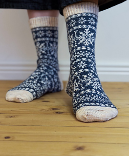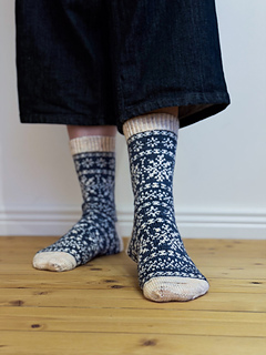 Stranded colorwork socks, knitted from the cuff down. The Luminen Socks are an homage to winter and snowflakes. Luminen means “snowy” in Finnish. These socks capture the serene magic of winter in a small, wearable project.