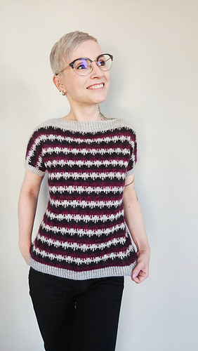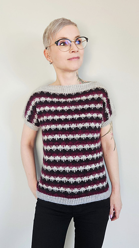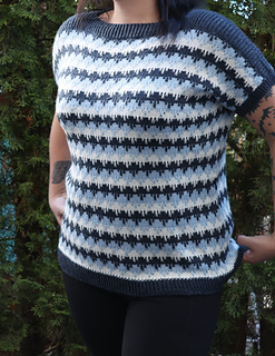 Das Modell wurde in Größe B gestrickt – Umfang des fertigen Shirts 98cm für einen Brustumfang von 86cm.