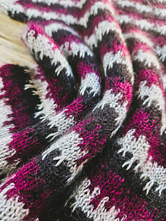 mit 3,25mm im dreifarbigen Hauptmuster mit Hebemaschen gestrickt, gewaschen und gespannt