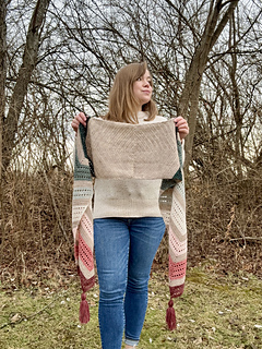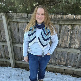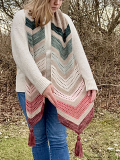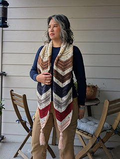 The scarf is worked in two identical panels that are seamed together, and is finished off with tassels on each end. It’s designed to use one main color, and seven contrasting colors, but can be worked up in any number of colors! Get creative with colors and dive into your minis or scraps for this one.