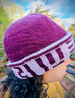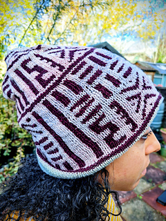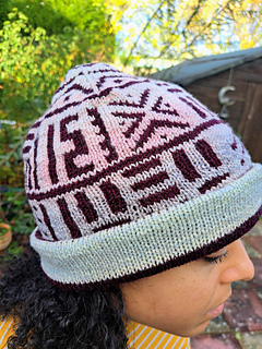 The hat uses a modified chart from the Mali Cowl pattern.