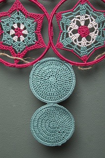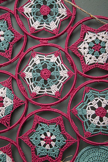 Layout: 10 mandalas in 15 cm rings, 2 mandalas in 10 cm rings, 1 wooden ring at the top