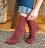 Worked with pure Manx Loaghtan yarn, these thick, cushy socks are designed to be worn in boots, but they can also be worn without boots as house slippers. A simple knit/purl pattern around the leg and along the instep adds textural interest. To prevent felting and shrinkage, handwash these special socks.