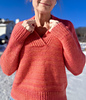 Les devants et le dos sont ensuite réunis, et le tricot se poursuit en aller-retour afin de terminer les augmentations de l’encolure. L’encolure est finalisée en tricotant ensemble la bande d’encolure, puis le chandail est travaillé en rond jusqu’à la bordure du bas en côtes.