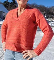The fronts and back are then joined, and the work continues flat to complete the neckline increases. The neckline is finished by knitting the neckband together, after which the sweater is worked in the round down to the bottom ribbing.