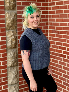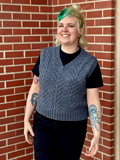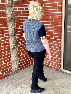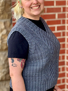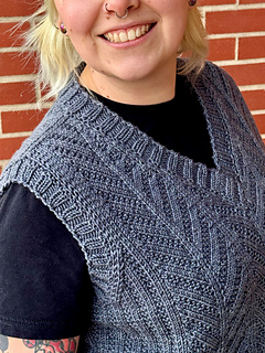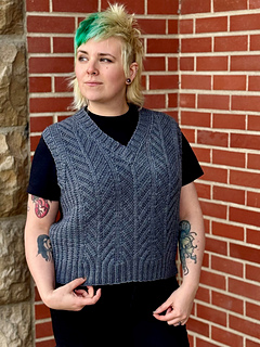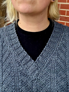 This vest is worked bottom up in the round until the armholes are reached and then it is split and worked flat. The body of the vest is worked in easy texture stitches that are based on patterns found in vintage sweaters, consisting of a Broken Rib stitch which is worked as a 2x2 “shifted“ version. Neckline, armholes, and waistband are all worked in 2x2 plain Rib to match the texture stitch.
