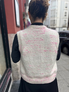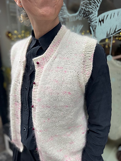 The Marta Vest is worked top down. It begins flat, as you cast on sts for the back and work to the underarm. Then sts are picked up at the shoulders, followed by a series of short rows to accommodate the neck opening and comfortably embrace the back. Afterwards, the fronts are worked to the underarm and the body is joined to be worked in one piece to the hem. Button plackets, armholes, and collar are worked after picking up sts and neatly finished in a sewn bind-off.