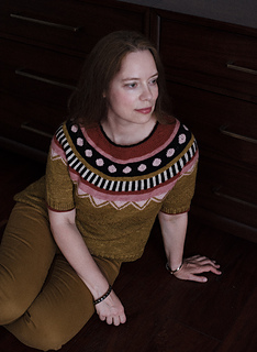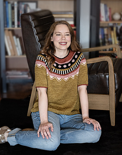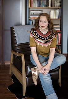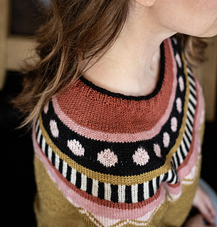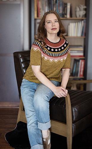 Bold colorwork and playful geometry define this short-sleeved pullover. The round yoke features striking bands of stripes, scallops, and polka-dot motifs that flow together in an eye-catching palette.