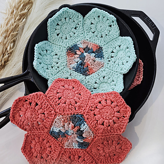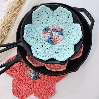 Create a beautiful and functional piece for your kitchen with this crochet flower pan saver pattern. Made from simple hexagons joined together, this design forms a stunning flower shape that works perfectly as a trivet, potholder, or pan protector.