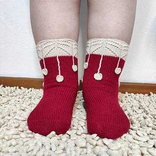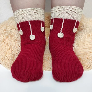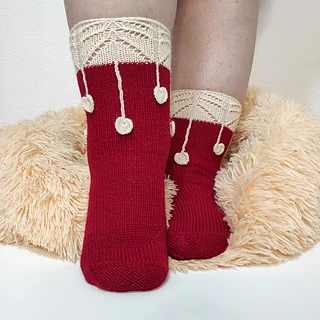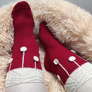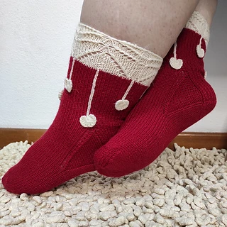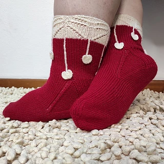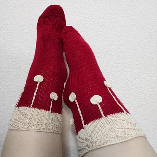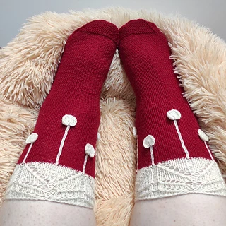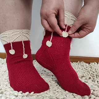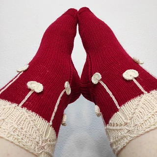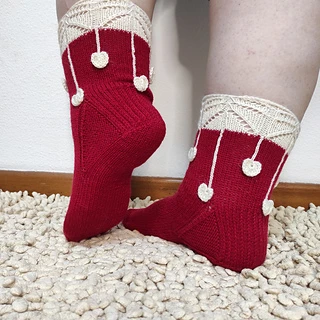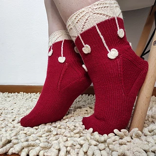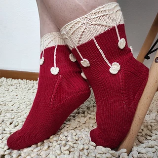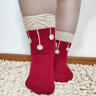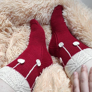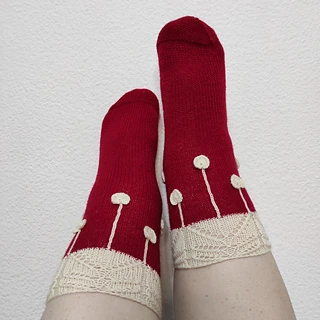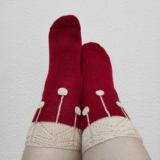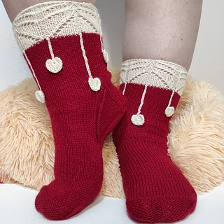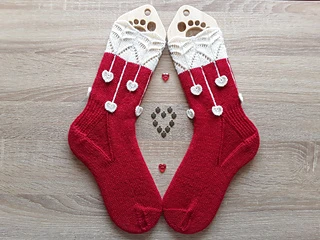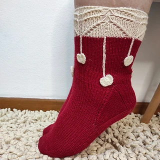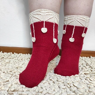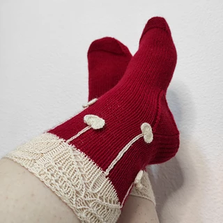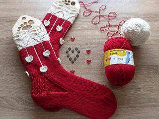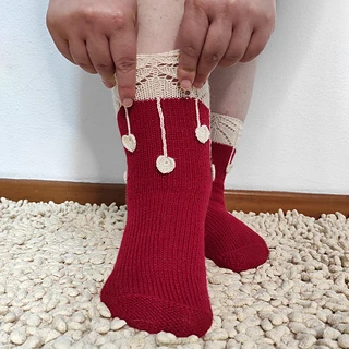 O par de meias segue a construção top-down, com uma variação do calcanhar tradicional reforçado e a biqueira cerzida. É adornado com um ponto rendado no cós que se transforma em “linhas de corações” na secção da perna.