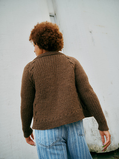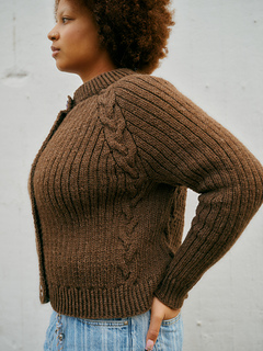 The cardigan is worked top down flat. You begin by working from the back neck, using 9-stitch cables on the raglan seams and 2 x 1 rib, while shaping the yoke with increases. After the increases, you continue working towards the underarm, incorporating raglan increases to shape the front and back pieces and both sleeves.