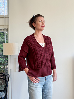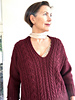 Stitches for the front panels are then picked up along the sloped edges at the top of the back piece. Since the cable pattern requires more stitches, additional stitches are increased to accommodate the motif. The front panels are worked down separately and joined to form a V-neck and knitted flat to the underarm, after which the back and front are joined and the body is worked in the round in one piece to the hem.