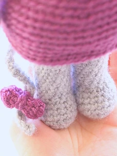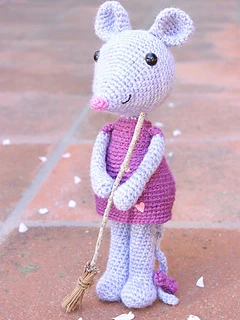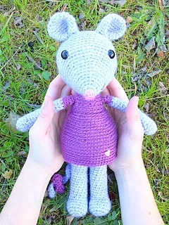 Mia, the cute mouse is 12 inches (30 cm) tall, using worsted weight yarn (size 4) on a G (4 mm) crochet hook.